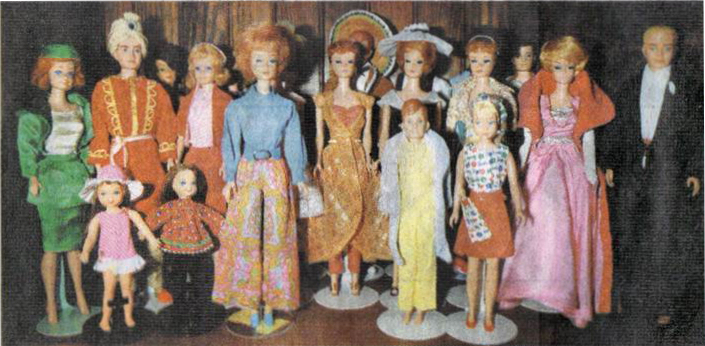 A collection of vintage Barbie and family dolls in vintage Mattel made outfits, including Linda Leake-Beard's first Barbie (fourth from left) wearing Mooxl Matchers. Some of the other ensembles pictured are Theatre Date (green) on Midge, Ken Arabian Nights (with turban). Dinner at Eight (rust/gold), Sophisticated Lady (pink ball gown), and Ken Tuxedo. In front the smaller dolls are (left) two Tutti dolls wearing original outfit and Skippin1 Rope, a Ricky doll wearing Lights Out, and Skipper, Barbie's younger sister, wearing A Day at the Fair, which had a miniature Barbie doll in the pocket.