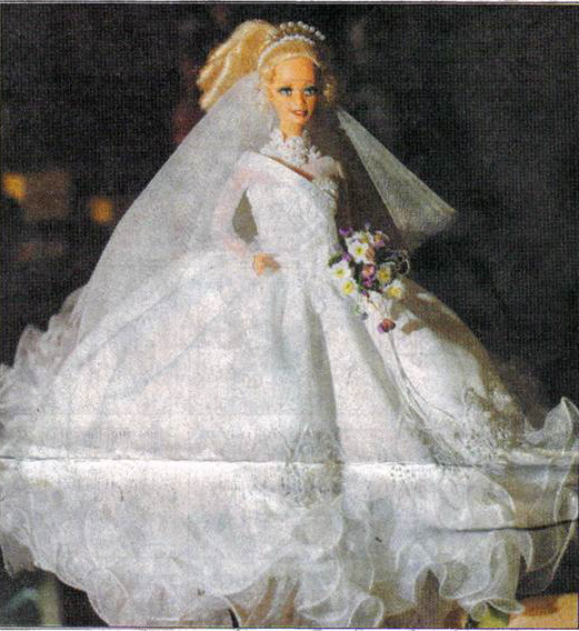 "Reflections Bride" a one-of-a-kind Barbie In a gown made by Linda Leake-Beard. This doll was made for a national competition.
